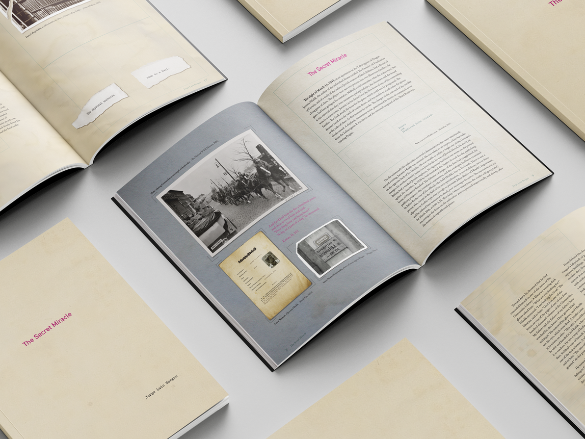 This project was based on a short story written by Jorge Luis Borges. To emphasize the story's background, World War II, the layout was designed to mimic an old document.